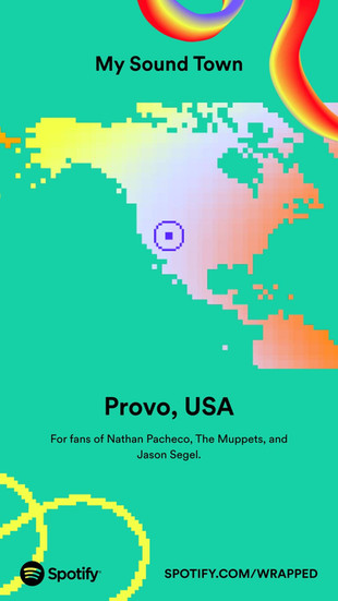 I have a really intense love-hate relationship with Spotify Wrapped. On one hand, it's really cool to see what music I've been listening too, but mainly I think it's a device designed to embarass the crap out of people. Somehow, the thing I'm most embarrassed about this year wasn't the fact that "Man or Muppet" from The Muppets was in my top five most streamed songs, or that I played Vienna by Billy Joel 504 times between January 3rd and October 31st. What topped the cake this year was Spotify telling me where "My Sound Town" is, and apparently it's Provo, Utah. I had no idea I liked the same music as a lot of Mormons, escpecially because I listen to a lot of comedic music with ocassional anti-religion sentiments. I then thought that maybe it's because I listened to The Book of Mormon soundtrack every now and then, but nowhere near often enough to have it show up on my Wrapped, and I doubt that's super popular in Utah anyway.