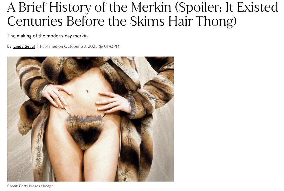 The Skims thong was very funny because it's essentially a merkin. For the uncultured, a merkin is a "pubic wig, a hairpiece worn over the genitals to simulate pubic hair, used for aesthetic, film, or novelty purposes, originating historically to cover symptoms of diseases like syphilis or pubic lice, but now common in entertainment and intimate wear for modesty or fashion."
